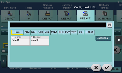 [Asunto] | Permite cambiar el asunto del correo electrónico. Si se han registrado frases de antemano, puede seleccionar un asunto de las frases registradas. |
