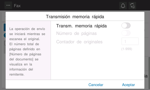Trans mem ráp es un método que permite enviar un fax escaneando una página tras otra. El número total de páginas enviadas puede introducirse en el registro del remitente.