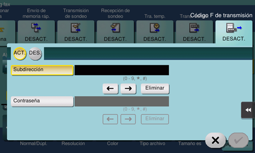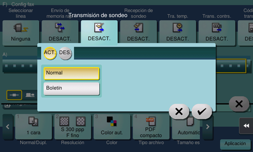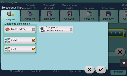 Temporizador de transmisión, distribución de repetición, comunicación confidencial, ECM desactivado, V.34 desactivado, transferencia de memoria rápida, transmisión internacional, contraseña de transmisión, transmisión de sondeo, recepción de sondeo, recepción de sondeo (boletín), código F de transmisión