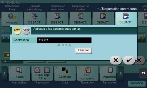 Toque [Aplicación] - [Config. fax] - [Transmisión contraseña] y toque [ON].