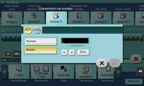Temporizador de transmisión, transmisión de sondeo, transmisión de sondeo (boletín), recepción de sondeo, recepción de sondeo (boletín), transmisión de difusión que incluya otros destinos que no son de fax
