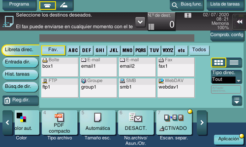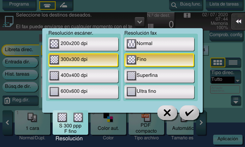[Resolución fax] | Seleccione la resolución empleada para enviar un fax. Cuando utilice una transmisión de fax, una transmisión de fax por Internet o una transmisión de fax por dirección IP, seleccione las siguientes resoluciones para escanear un original.