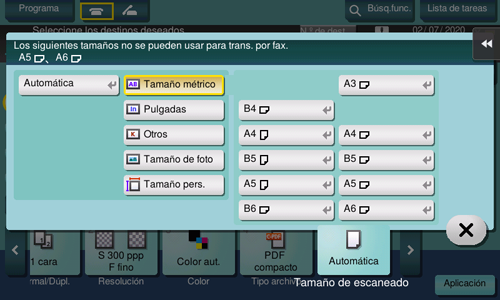 [Tamaño métrico] | Seleccione esta opción para escanear un original de tamaño métrico. Toque [Tamaño métrico] y seleccione el tamaño métrico estándar respectivamente. |