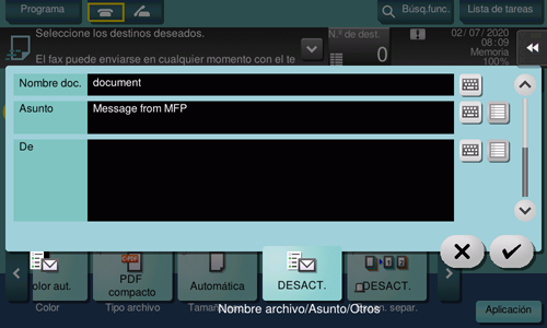 Cambie el nombre de archivo del original escaneado. Cuando envíe por correo electrónico, puede especificar el asunto y el texto del mensaje de correo electrónico y cambiar la dirección de correo electrónico del remitente (dirección "De").