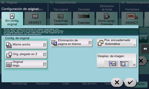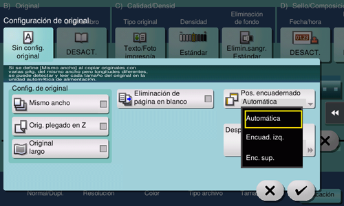 [Borrado central] | Permite especificar la anchura de pliegue que se debe borrar. Esta función permite eliminar la sombra que se crea en el centro cuando la cubierta de originales no se puede cerrar del todo debido al grosor del original. |