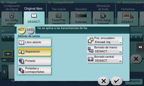 [ACT.]/[DES.] | Seleccione [ON] para especificar Original libro. |