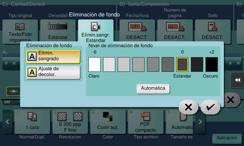 [Nivel de eliminación de fondo] | Permite ajustar la densidad del color de fondo de un original con fondo de color. Seleccionando [Auto] se determinará automáticamente la densidad del color de fondo y se escaneará el original al nivel óptimo de densidad de fondo. |