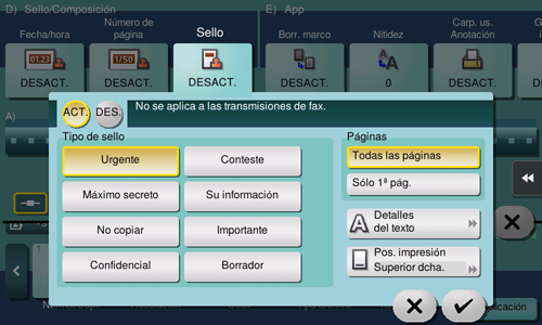 [ACT.]/[DES.] | Seleccione [ON] para especificar el sello. |