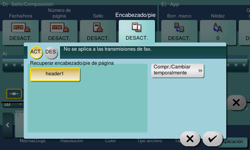 [Comprobar/Cambiar temp.] | Si es necesario, compruebe o cambie temporalmente los detalles del programa seleccionado en [Recuperar encabezado/pie de página].