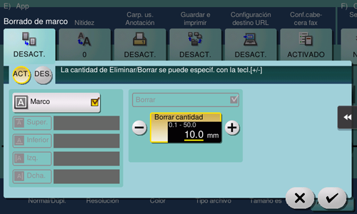 [Super.]/[Inferior]/[Izq.]/[Dcha.] | Especifique un ancho distinto para borrar cada lado del original. Cancele el ajuste de [Marco], seleccione el lado para borrar el marco y especifique la anchura por borrar en [Borrar cantidad]. Si no desea borrar el lado, cancele la configuración de [Borrar]. |