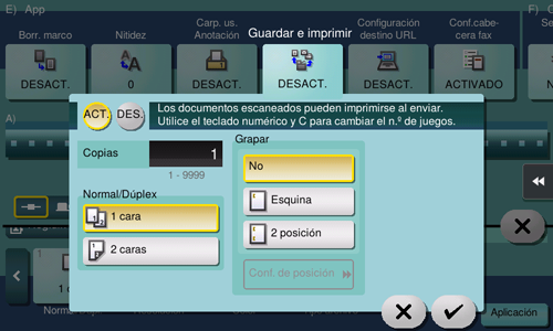 [ACT.]/[DES.] | Seleccione [ON] para ejecutar el envío y la impresión al mismo tiempo. |