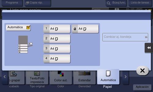 [Automática] | Selecciona automáticamente el papel que se ajuste al tamaño del original al realizar una copia. |