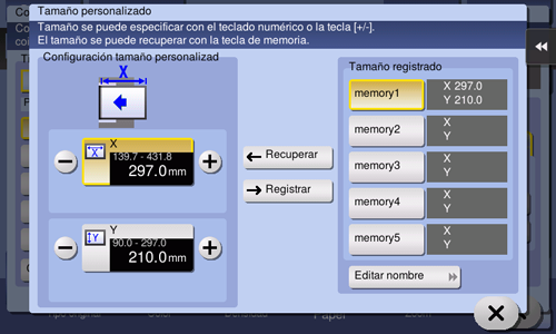 [Configuración tamaño personalizado] | Especifique el largo (X) y el ancho (Y) del papel. Después de haber especificado el tamaño, seleccione una tecla ([memoria1] a [memoria5]) en [Tamaño registrado] y toque [Nueva]. A continuación, el tamaño que usted ha especificado, se registra en la memoria. Puede recuperar el tamaño registrado en otro momento. |