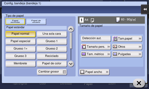 [Tipo de papel] | Seleccione el tipo del papel cargado en la bandeja de papel seleccionada. Para obtener más información sobre los tipos de papel disponibles, consulte Aquí. Cuando esté utilizando papel normal de 15-15/16 lb a 18-5/8 lb (de 60 g/m2 a 70 g/m2, toque [Cambiar grosor]. La bandeja de papel con [Cambiar grosor] seleccionado tendrá un nivel de prioridad menor que las bandejas de papel que tengan cargado papel normal. No obstante, si se selecciona [Cambiar grosor] en todas las bandejas de papel, se selecciona la bandeja más adecuada en función de la secuencia de prioridad especificada en [Configuración de selección de bandeja APS] (Aquí). |