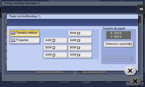 [Tamaño métrico] | Si va a cargar un papel ancho en tamaño métrico en la bandeja de papel, seleccione el tamaño de papel. |