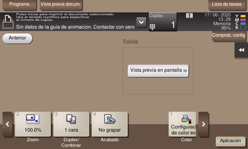 Si no se puede mostrar una imagen de salida, aparece [Vista previa pantalla]. Para comprobar una imagen de salida, toque [Vista previa pantalla] y confirme la imagen de salida en la pantalla de vista previa.
