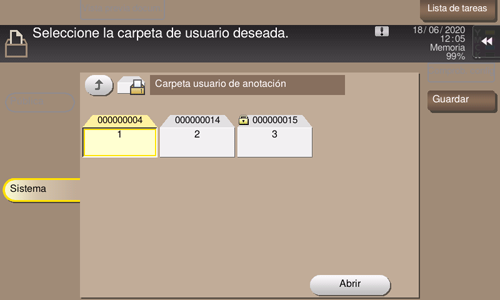 Seleccione una carpeta de usuario para guardar un archivo y toque [Guardar].