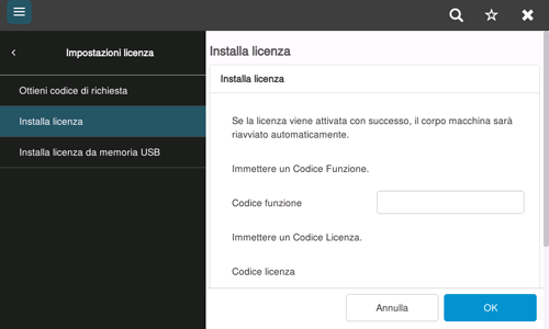 La registrazione della licenza consente di ottenere il codice licenza. Registrare il codice licenza in questa macchina per attivare la funzione.