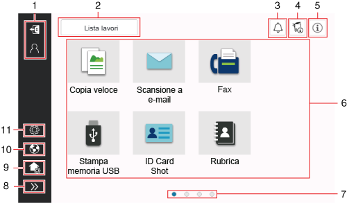 2 | [Lista lavori] | Visualizza i lavori attivi o in sospeso. Se necessario, è possibile controllare dei registri lavori o stampare un rapporto di comunicazione. Questa lista visualizza lo stato operativo del lavoro corrente sul tasto [Lista lavori] quando è in funzione. Se necessario, è possibile interrompere il lavoro attivo utilizzando il tasto stop visualizzato accanto al tasto [Lista lavori]. Per informazioni dettagliate su [Lista lavori], fare riferimento a Qui. |