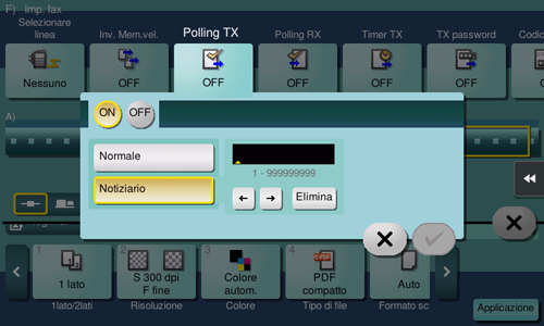 [Notiziario] | Selezionare questa opzione per registrare un file per il polling nella casella bollettino. Inserire il numero casella utente della casella bollettino che si desidera registrare. La casella bollettino può avere solo un file. È possibile creare fino a un massimo di 10 caselle bollettino. Possono essere utilizzate in base all'uso desiderato. |