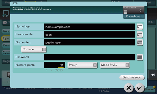 [Anonimo] | Quando l'autenticazione non è richiesta nel Server FTP, impostare questa opzione su ON (predefinito: OFF). |