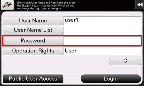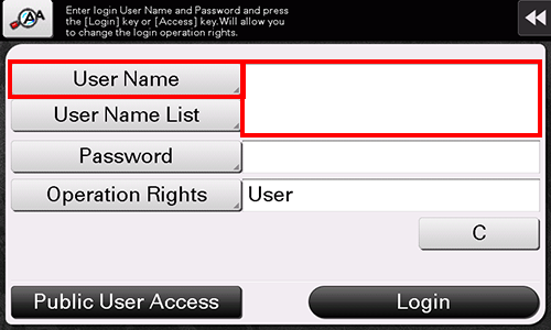 When user authentication is enabled on this machine, the login screen is displayed. Enter the user name and the password, and perform user authentication.