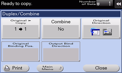 [Original > Copy] | Select a combination of original scanning side (Simplex/Duplex) and original printing side (Simplex/Duplex). To scan a 2-sided original, specify whether to set the original to Top Bind or Left Bind/Right Bind in [Original Binding Pos.]. To make a 2-sided copy, specify whether to set a copy to Top Bind or Left Bind/Right Bind in [Output Bind Direction]. |