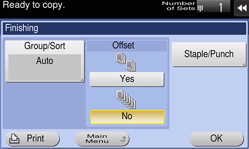 [Offset] | Select [Yes] when sorting by copies or by page to feed out paper. If [Offset] is set while an output option such as Finisher is installed, the printed sheets are shifted and output by copies or page. Even if an output option is not installed, the printed sheets are sorted and output by copies or page in an alternating crisscross pattern when [Offset] is specified while the following conditions are satisfied.