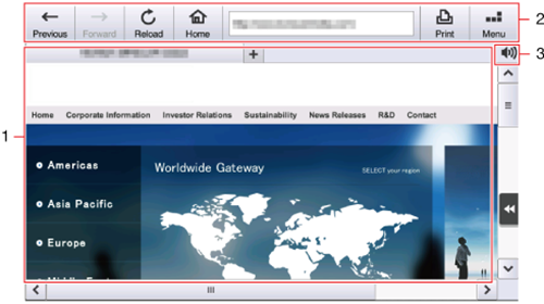 1 | Window | Displays the contents of a loaded page. If the screen has multiple windows, their tabs are displayed at the top of the screen. Tapping a tab switches windows. This system supports up to five tabs. Tapping the Close button ( |