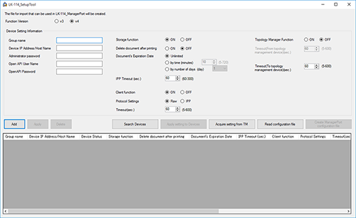 [Create ManagerPort configuration file] | Creates a configuration file to load to LK-114_ManagerPort. This function is available when [Function Version] is set to [v4]. |