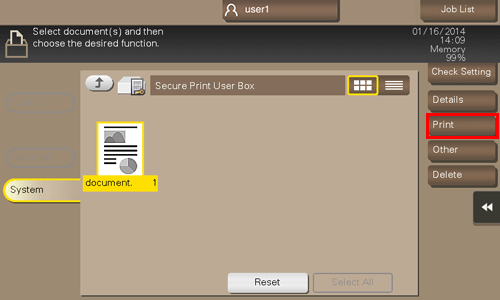 If [Prohibit Functions] is set to [Mode2] in [Utility] - [Administrator] - [Security] - [Security Details] - [Prohibit Functions], you need to also enter the password when selecting a file from the Secure Print User Box. You need to enter the password for each file even if secure documents have the same document ID. Therefore, the security level is higher than that of default [Mode1].