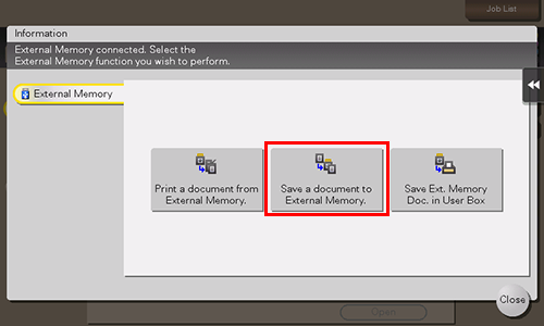 You can also perform the same operation by tapping [System] - [External Memory] - [Save] in User Box mode.