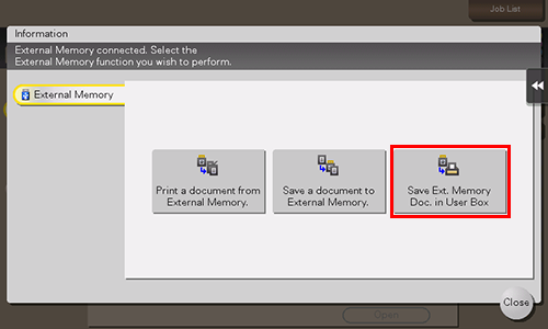 You can also perform the same operation by tapping [System] - [External Memory] in User Box mode.