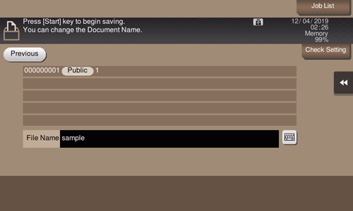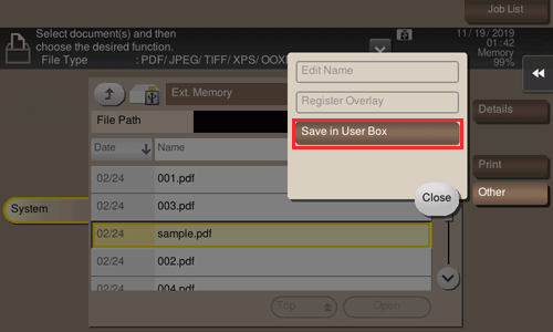 A password-protected PDF file is stored in the Password Encrypted PDF User Box. For details on how to operate a file saved in the Password Encrypted PDF User Box, refer to Printing/Saving a File in a User Box.
