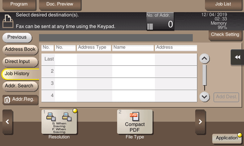 Tapping [Job History] displays a list of transmission logs. Specify the target destination from the previous five job histories.