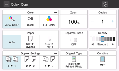 The Quick Copy screen displays setting items of the copy function in the card format. You can tap the target card to change the setting. When you want to select a setting other than the displayed three options in an item that provides three options such as [Paper] and [Duplex Settings], tap the Detail icon (