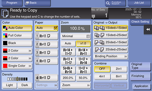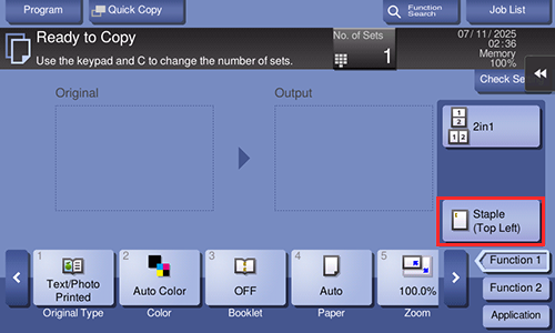 You can arrange a key (finishing program), in which a combination of finishing settings is registered, on the main screen in copy mode of classic style. If you arrange the frequently used combination of finishing settings as a recall key on the main screen, it will be useful to specify the setting with a single key action.