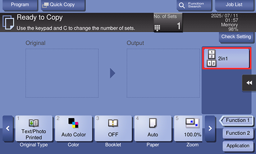To set the quick setting key, select [Utility] - [Utility] - [Customize] - [Copier Settings] - [Quick Settings 1]/[Quick Settings 2].