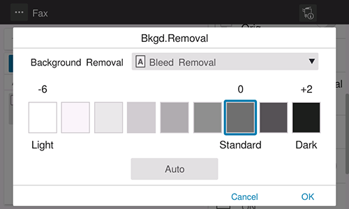[Bleed Removal] | Adjust the density of the background color to prevent bleeding of the back of the paper when printing a 2-sided original that is so thin that the contents of the back side would be scanned. Selecting [Auto] automatically determines the density of the background color, and scans an original at the optimum background density level. |