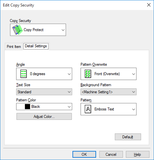 [Pattern Color] | Select the color of the copy security pattern. As necessary, click [Adjust Color...] to adjust the density and contrast. |