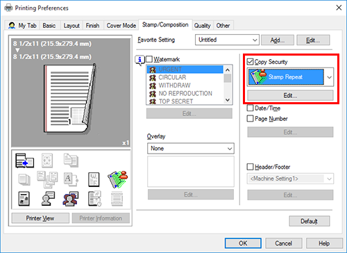 In the [Stamp/Composition] tab, select the [Copy Security] check box, and then select [Stamp Repeat].