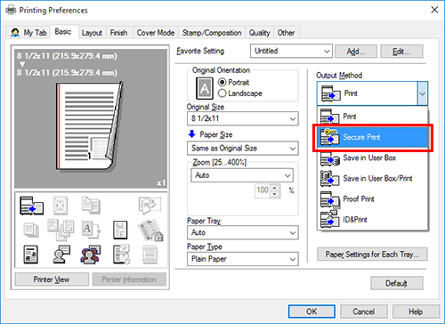 In [Device Option] of the [Configure] tab on the printer drive, set [Security Document Setting] to [Release Secure Print] (default: [Do Not Release Secure Print]). For details on [Device Option], refer to Configuring the optional environment of this machine.