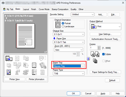 From [Original Size] in the [Basic] tab, select [A4] ([8 1/2x11]), then select [A4 Tab] ([8 1/2x11 Tab]) from [Paper Size].