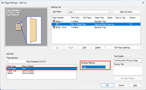 Select [Tab Paper], and also select [Use] from [Change Settings].