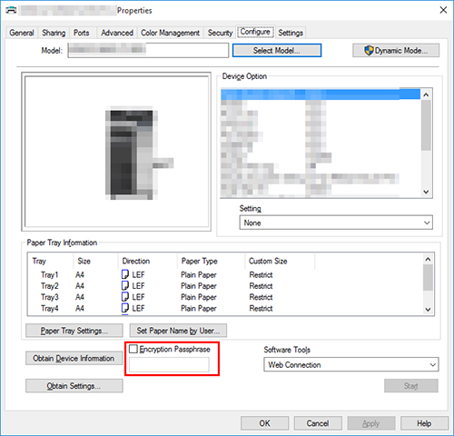 If OpenAPI communication is SSL-encrypted and the device information can be automatically obtained from the printer driver, the encrypted passphrase can be obtained from this machine. For details on how to encrypt OpenAPI communication with SSL, refer to