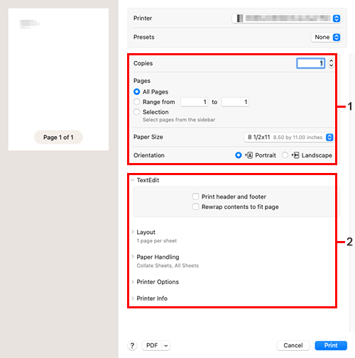 Set the functions provided by the driver in each menu of [Output Method], [Layout / Finish], [Paper Tray / Output Tray], [Cover Mode], [Per Page Setting], [Stamp / Composition], and [Quality] that are displayed in [Printer Options] (macOS 13 or later only) of the [Print] screen.