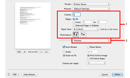 The print settings you have changed here are reset to the defaults when you exit the application software. It is useful to register frequently used print settings as presets. For details, refer to Registering Frequently Used Print Settings.