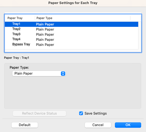 When [Paper Settings for Each Tray] is enabled in the [Options] page of the printer driver, select [Paper Settings for Each Tray...] in [Paper Tray / Output Tray], and specify the paper type for each tray.