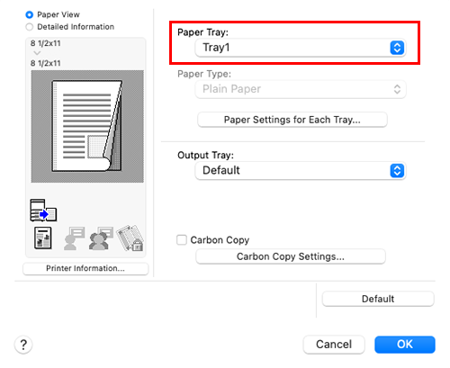 [Carbon Copy Tray] | Select the paper tray for carbon copies. Select the check boxes for all paper trays to be used. |