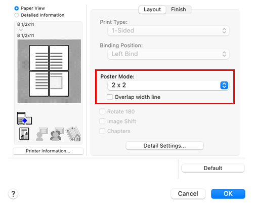 In [Poster Mode] of [Layout / Finish] - [Layout], select "N e N". For example, when you select [2 e 2], one page of the original image is enlarged, divided, and printed on four sheets.